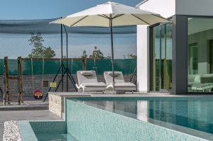 Zwei Schlafzimmer befinden sich ebenfalls im Erdgeschoss, während 2 weitere Schlafzimmer im Obergeschoss sind. Alle Schlafzimmer sind klimatisiert und haben ein en-suite Badezimmer. Die beiden Schlafzimmer im ersten Stock haben zudem einen Zugang zum großen Balkon mit herrlichem Blick auf die Umgebung. Die große Terrasse bietet einen Loungebereich, einen eingebauten Holzkohlegrill und einen überdachten Essbereich im Freien – Ideal für gemütliche Abendessen bei Sonnenuntergang. Der private Pool sorgt an warmen Sommertagen für Erfrischung und die Sonnenliegen laden zum Entspannen ein. Zudem bietet Ihnen das großzügige Anwesen neben viel Grünflächen auch einen privaten Basketballplatz.
